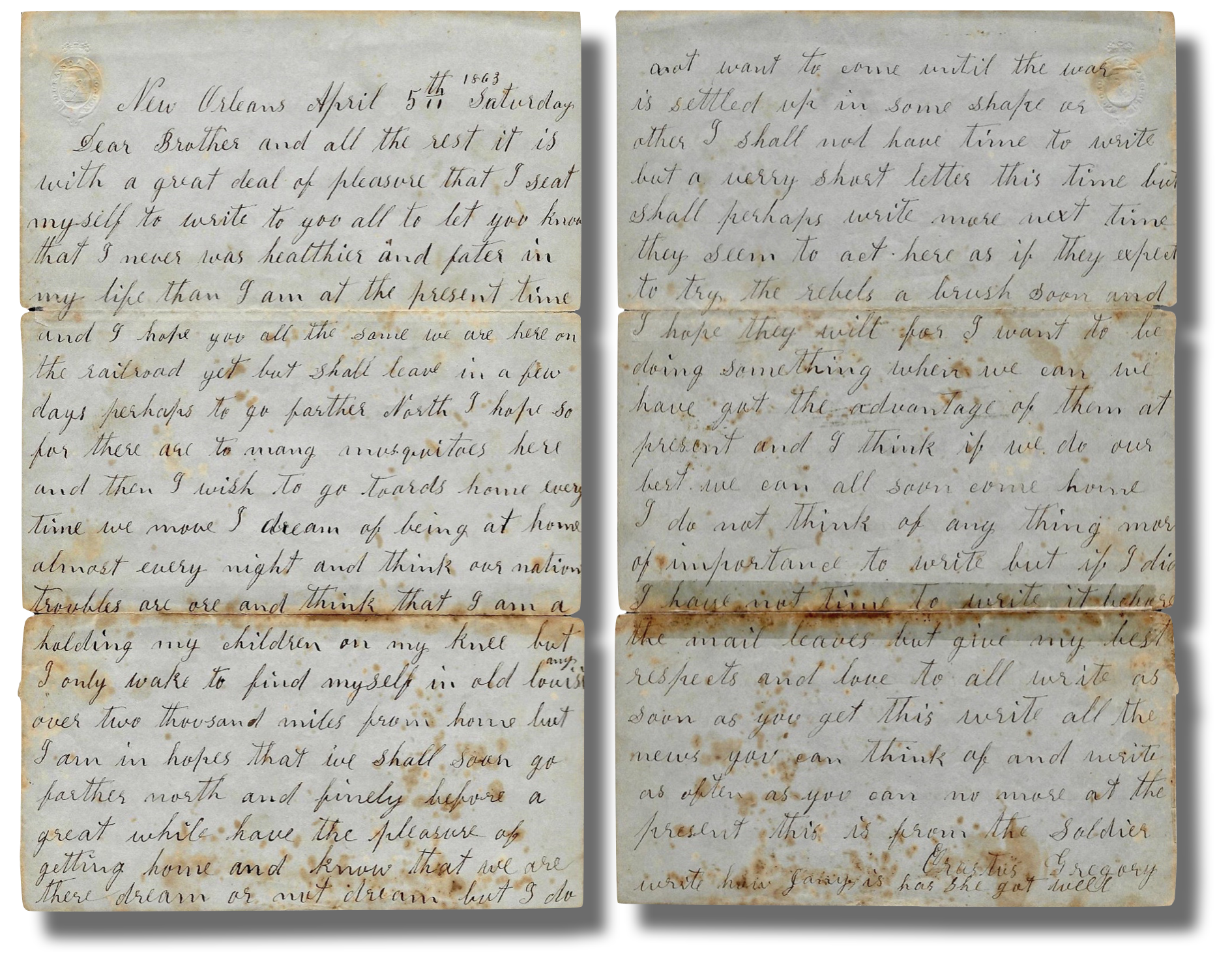 We are here on the railroad yet but shall leave in a few days perhaps to go farther North. I hope so for there are too many mosquitoes here and then I wish to go towards home every time we move. I dream of being at home almost every night and think our national troubles are over and think that I am a holding my children on my knee but I only wake to find myself in Old Louisiana over two thousand miles from home. But I am in hopes that we shall soon go father north and finally before a great while have the pleasure of getting home and know that we are there—dream or not dream. But I do not want to come until the war is settled up in some shape or other.