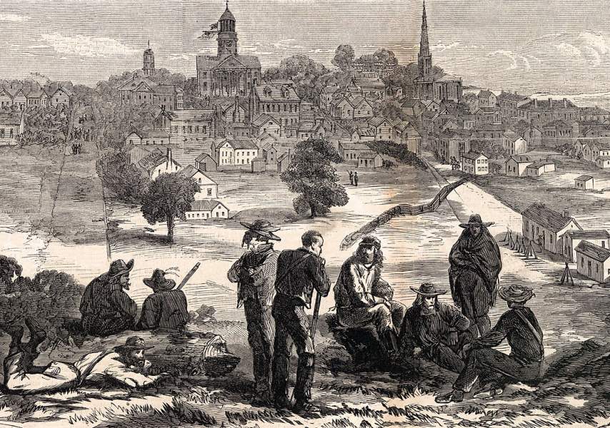The rebels soon marched out in front of the strongholds and stacked their arms, leaving them in our care. They then started for the city. Our boys from camp soon followed them and the city was soon filled with Union soldiers. About noon they began to return to camp, laden with such things as they found—paper, books, clothing, tools of all kinds, saddles and lots of fancy things. I was on picket & could not leave. Had to stand there in the hot sun all day. Was relieved at 9 o’clock at night. I was so tired I went to bed without knowing or anything about it. It’s not all play in being a soldier, I tell you. We have been on picket or other duty every other day and night too—not allowed to sleep at night. Stay awake all night until we are pretty well worn out and this is not all here. In some trying moments, we have some of our number laid away in the cold grave and cannot have a moment to bid adieu to them or [go] to the spot where they lie. Another drops out of the ranks sick. He is sent away perchance we never see him more. Doth God do all thing well? Oh yes, let us trust Him.