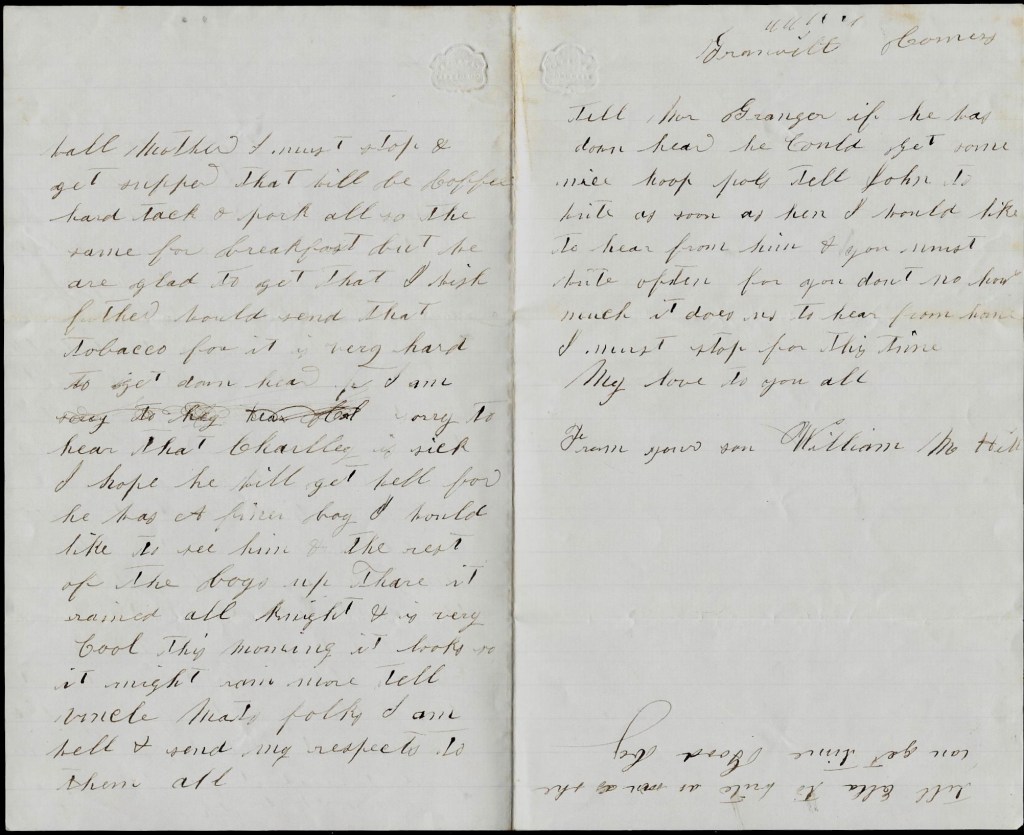 Tell Mr. Granger if he was down here he could get some nice hoop poles. Tell John to write as soon as he can. I would like to hear from him & you must write oftener for you don’t know how much [good] it does us to hear from home. I must stop for this time. My love to you all.