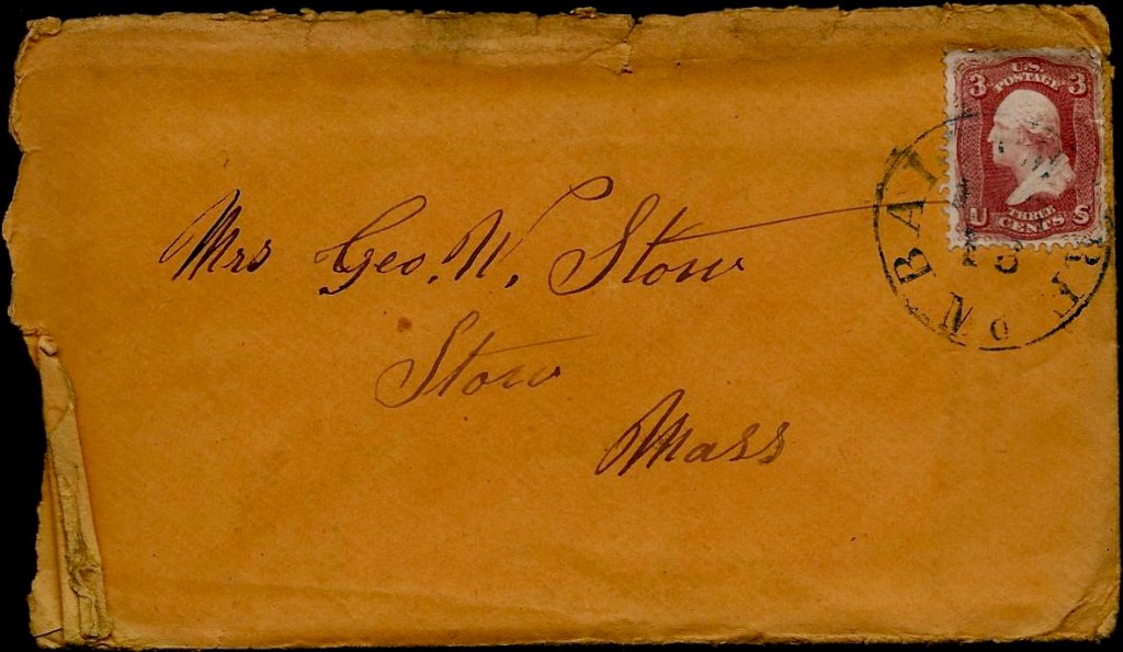 Charles wrote the letter to his aunt, Sarah Pool (Dockendorff) Stow (1810-1888), the wife of George Washington Stow (1813-1895), and the daughter of John and Nancy (Yates) Dockindorff of China, Maine.