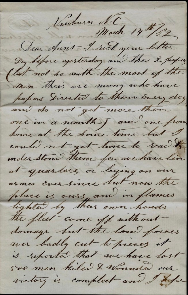 I received your kind letter and also the paper that you sent but I have been prevented from writing by being on an expedition up the Albemarle Sound and have just returned. Victory follows the general [Burnside] wherever he goes. He is the pride of the army as well as the civilians where he is known.