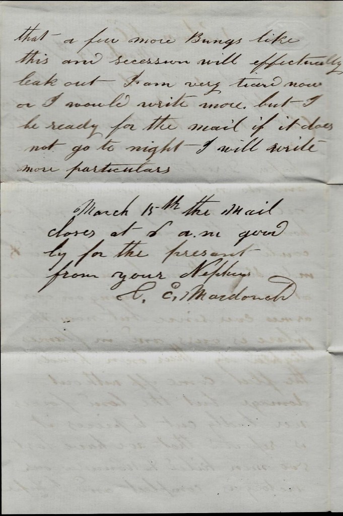 March 15th the mail closes at 6 a.m. Goodbye for the present. From your nephew, — C. E. Macdonald
