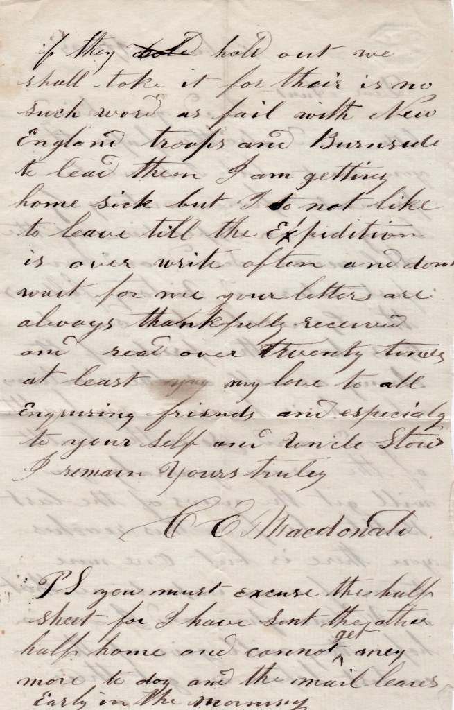 P. S. You must excuse the half sheet for I have sent the other half home and cannot get any more today and the mail leaves early in the morning.