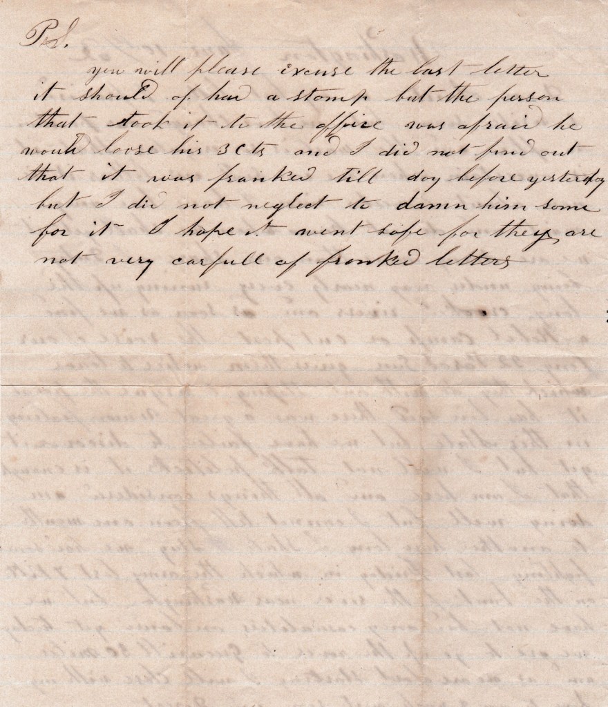 P. S. You will please excuse the last letter. It should of had a stamp but the person that took it to the office was afraid he would lose his 3 cents and I did not find out that it was franked till day before yesterday but I did not neglect to damn him some for it. I hope it went safe for they are not very careful of franked letters.