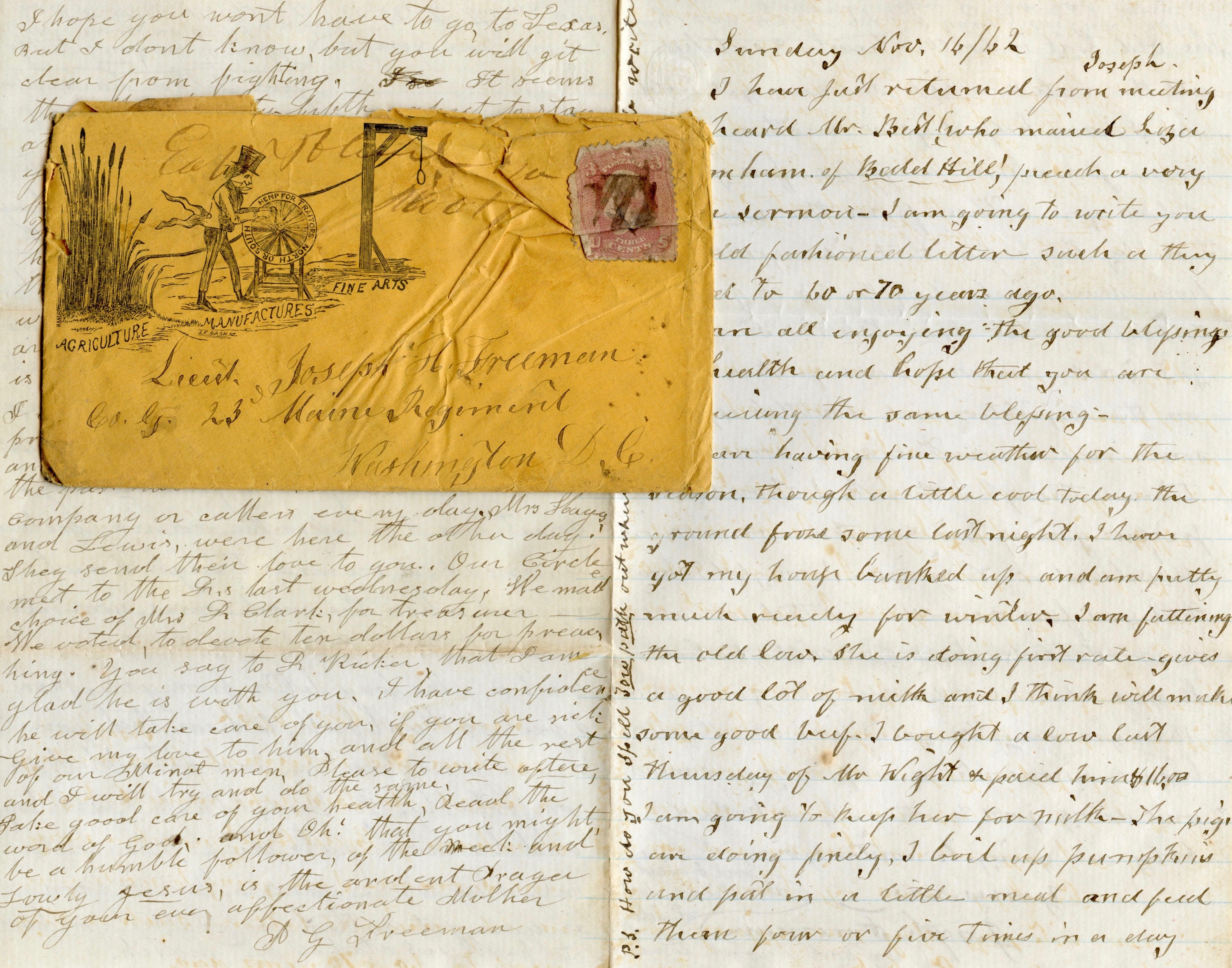 This home front letter was written jointly by Joseph Freeman (1791-1865) and his second wife, Abigail (Gross) Freeman (1805-1879) of Minot, Androscoggin county, Maine. They wrote the letter to their son, Lt. Joseph Hewett Freeman (1841-1931) of Co. G, 23rd Maine Infantry—a nine-month’s regiment. They were never under fire during the ten months they were in service but they lost 50 men by disease and two by accident. Joseph later served as Captain of Co. H, 14th Maine Infantry.