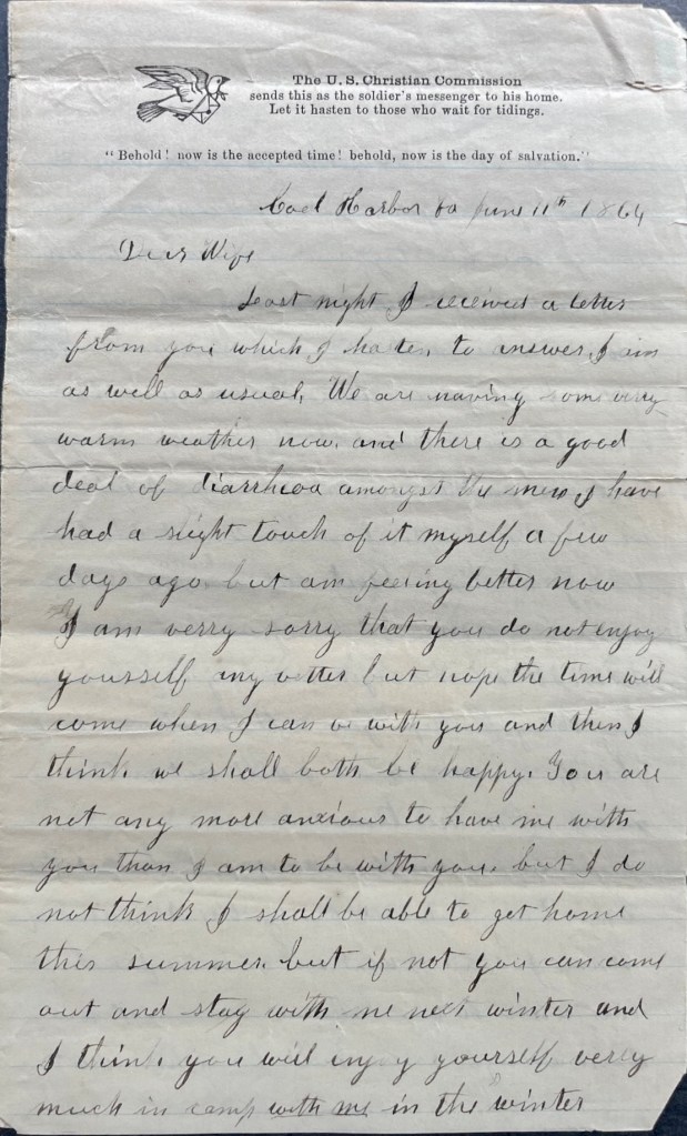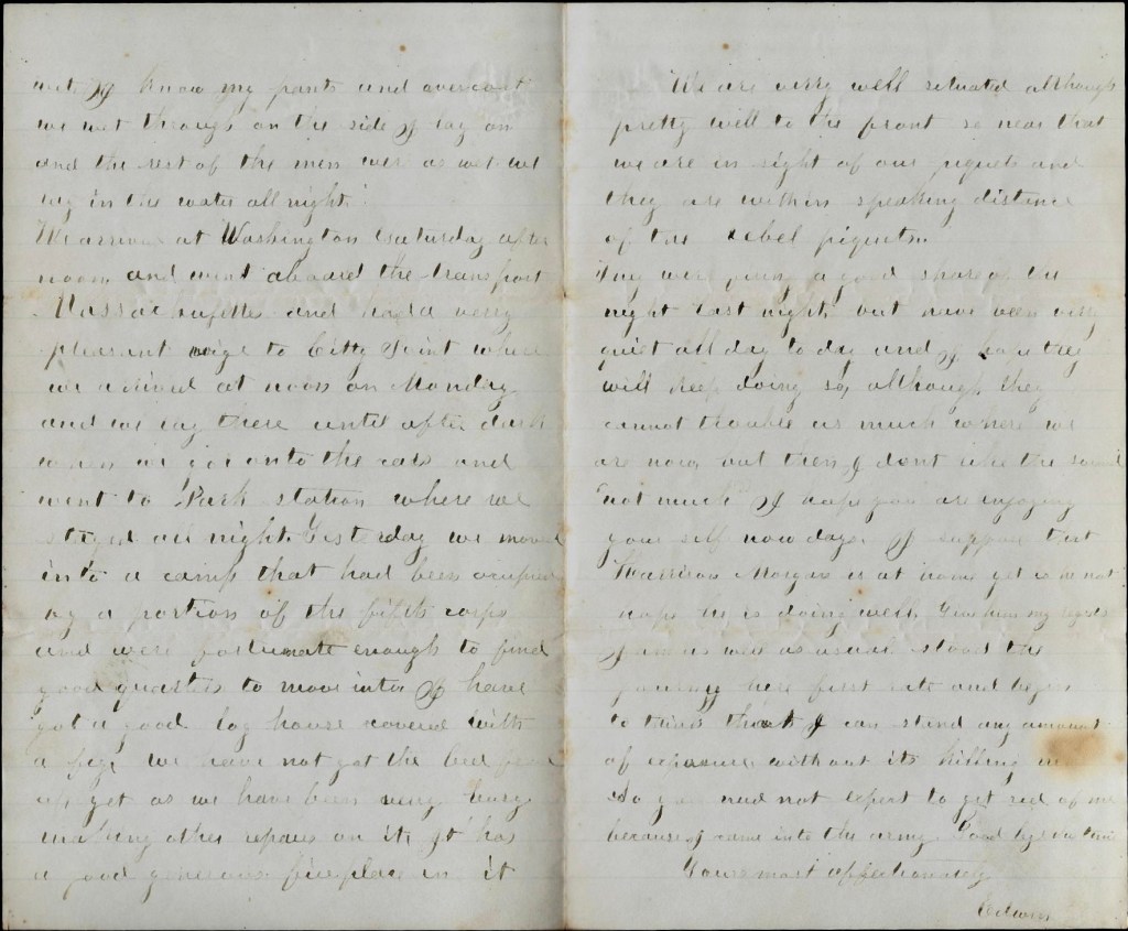 we arrived at Washington yesterday afternoon and went aboard the transport Massachusetts and had a very pleasant voyage to City Point where we arrived at noon on Monday and we lay there until after dark when we got into the cars and went to Park Station where we stayed all night. Yesterday we moved into a camp that had been occupied by a portion of the Fifth Corps and were fortunate enough to find good quarters to move into. I have got a good log house covered with a [ ]. We have not got the bed put up yet as we have been very busy making other repairs on it. Jo has a good generous fireplace in it. We are very well situated although pretty well to the front. We hear that we are in sight of our pickets and they are within speaking distance of the rebel pickets.