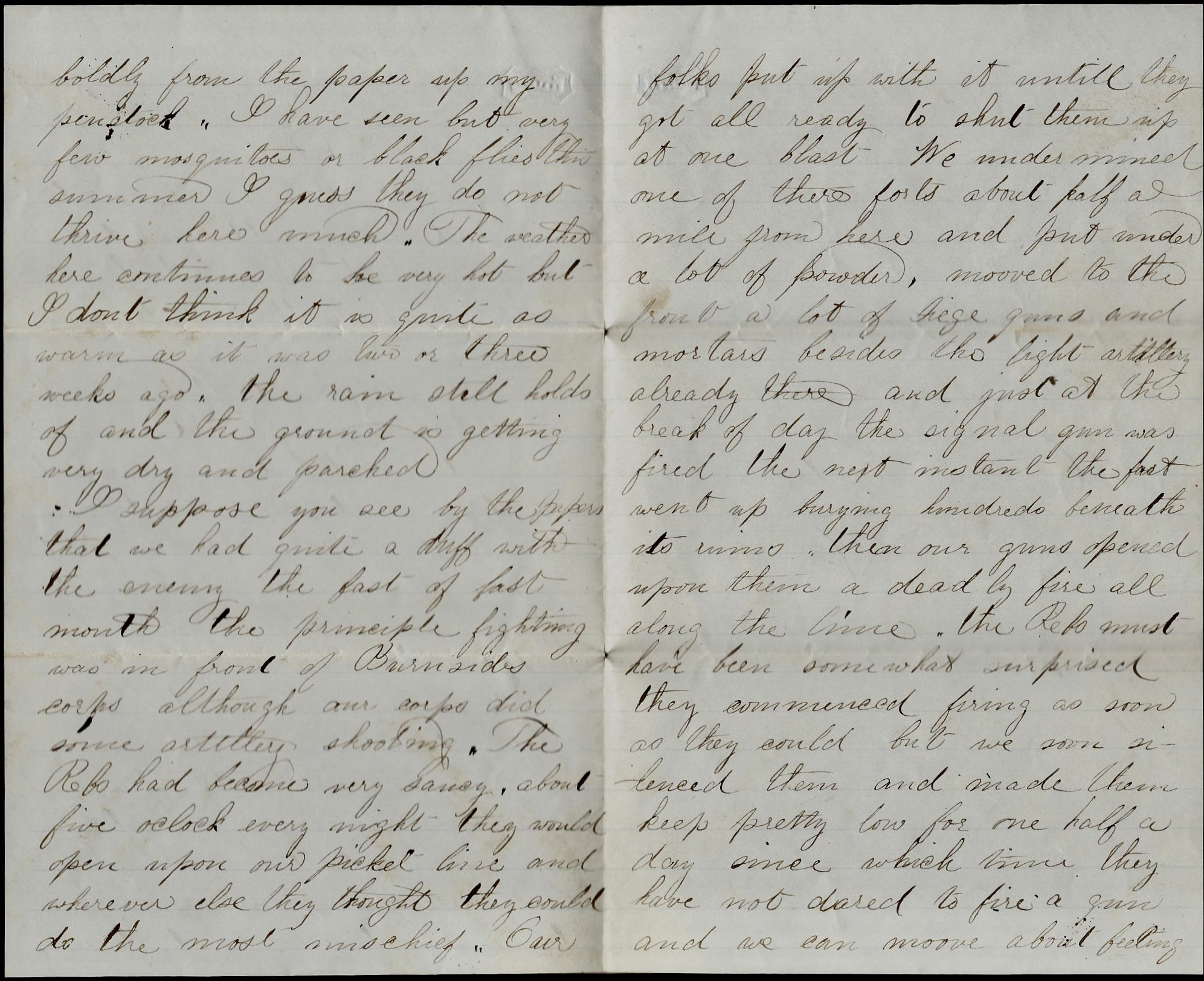 I suppose you see by the papers that we had quite a duff with the enemy the last of last month. The principal fighting was in front of Burnside’s Corps although our corps did some artillery shooting. The Rebs had become very saucy. About five o’clock every night they would open upon our picket line and wherever else they though they could do the most mischief. Our folks put up with it until they got all ready to shut them up at one blast. We undermined one of their forts about half a mile from here and put under a lot of powder, moved to the front a lot of siege guns and mortars besides the light artillery already there and just at the break of day, the signal gun was fired. The next instant the fort went up burying hundreds beneath its ruin. Then our guns opened upon them a deadly fire all along the line. The Rebs must have been somewhat surprised. They commenced firing as soon as they could but we soon silenced them and made them keep pretty low for one half a day since which time they have not dared to fire a gun and we can move about feeling a little more secure than before.