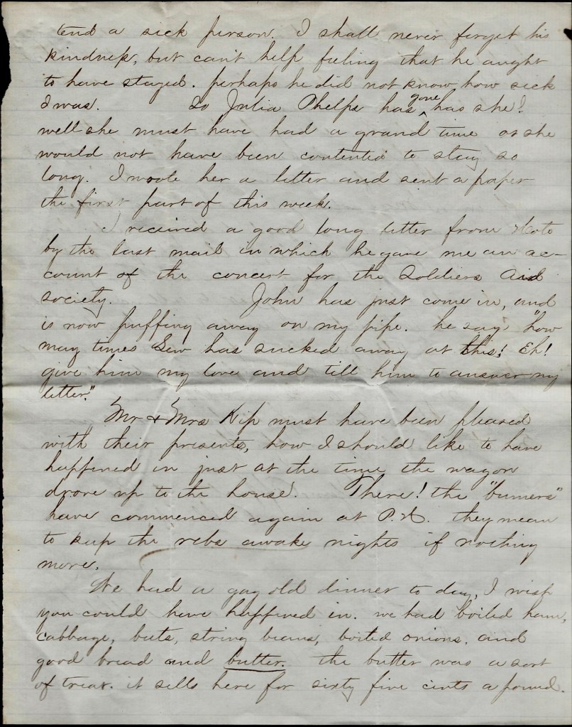 I received a good long letter from Hote by the last mail in which he gave me an account of the concert for the Soldiers Aid Society. John has just come in and is now puffing away on my pipe. He says, “How many times Lew has sucked away at this! Eh! Give him my love and tell him to answer my letter.”