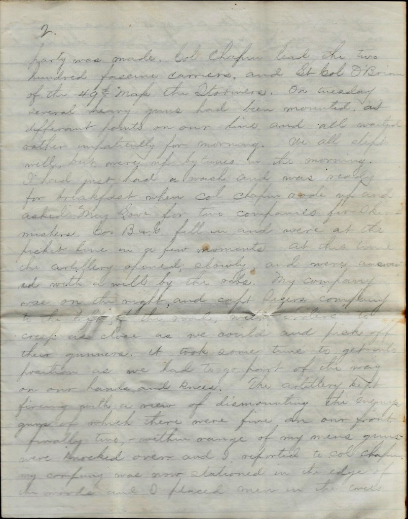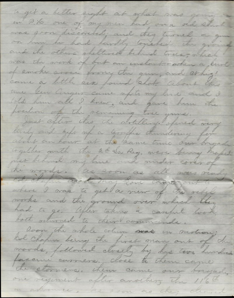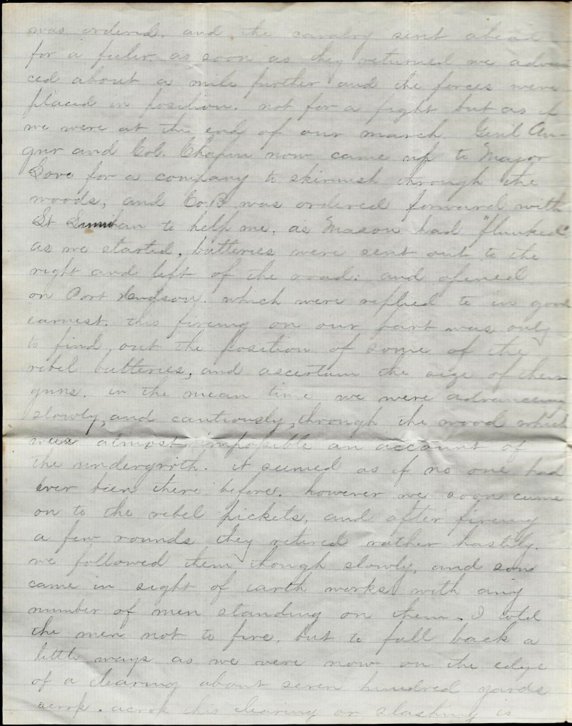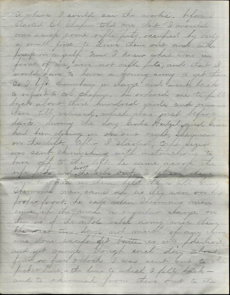 We followed them though slowly and soon came in sight of earthworks with any number of men standing on them, I told the men not to fire but to fall back a little ways as we were now in the edge of a clearing about seven hundred yards across, Across this clearing or slashing is where I could see the works. Before I started Col. Chapin told me that I would come across some rifle pits occupied by only a small force [and that I was] to drive them out and take possession myself. Now I knew what was in front of me were not rifle pits and that I would have to have a young army to take them so I left Linahan in charge and went back to report to Col. Chapin. He ordered me to fall back about three hundred yards and remain there till relieved which was just before dark.