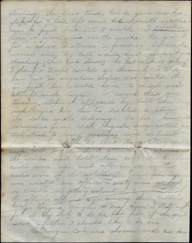 The next two days not much of anything was done except get batteries into position and get range though each day about four or five o’clock I was sent out to the picket line—the line to which I fell back—and to skirmish from there out to the slashing. The last time, Col. Chapin gave me his glass, for I had left mine behind, with instructions to find out all I could. I reported three or four guns on the works. The ground for a short distance in front of the woods covered only by tall weeds and grass; beyond slashing (trees cut down). The Col. asked me if I though troops could go through. I told him not in regular order, nor could they go fast. They would have to climb over stumps and logs. It seems that on Tuesday, although opposed by both Sherman and Augur, General Banks decided to storm the works in the morning. So four hundred volunteers from each brigade were called for—two hundred to carry fascines and deposit them in the ditch so that the artillery could cross, and two hundred stormers to mount the works and hold them till the support could come up, and all go in together under cover of the artillery.