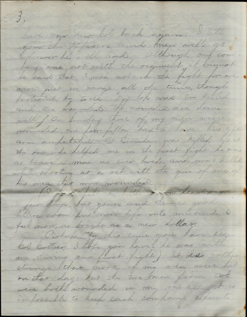 Although my company was not with the regiment [in the assault], it cannot be said that I was not in the fight for we were just in range all the time, though protected by trees. My loss was two killed and two wounded. The wounded are doing well. On Sunday, three of my men were wounded. One poor fellow had to lose his left arm amputated. Lt. Linahan was killed. He is the one who helped me in the first fight. He was as brave a man as ever lived and was killed while shooting at a reb with the gun of one of his men that was wounded.