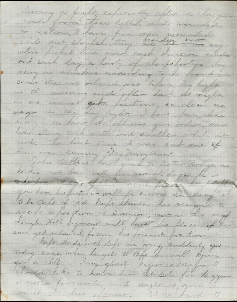 John Dobbins has gone to Baton Rouge as he has not been well for several days. He is to be promoted to fill [Lt. John B.] Mason’s place. Sergt. [Oscar F.] Tiffany—you have his picture—will be Second Lieutenant, [Wilson H.] Gray is to be Captain of Co. D. Capt. [George G.] Stanbro [of Co. F] has resigned to accept a position as surgeon, not in this regiment though. Will Seymour will have his place if he can get relieved from his present position.