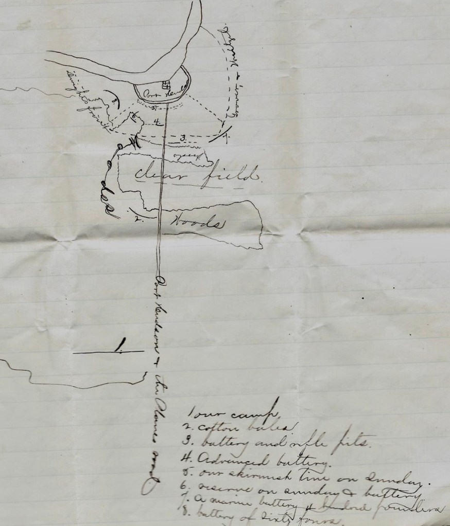I was at our camp this morning and wrote a letter home but have since read your letter commenced May 31st and two from brother Lewie—one May 31st and June 5th—and we are resting today so can write you a few lines more and have ready to send by the next opportunity. No knowing when we may be off duty again. I don’t know as you can make out anything by the map I sent you but we are now in the edge of the woods just behind the cotton bales. The bales were hauled here for building batteries or for other purposes in which they can be made useful.