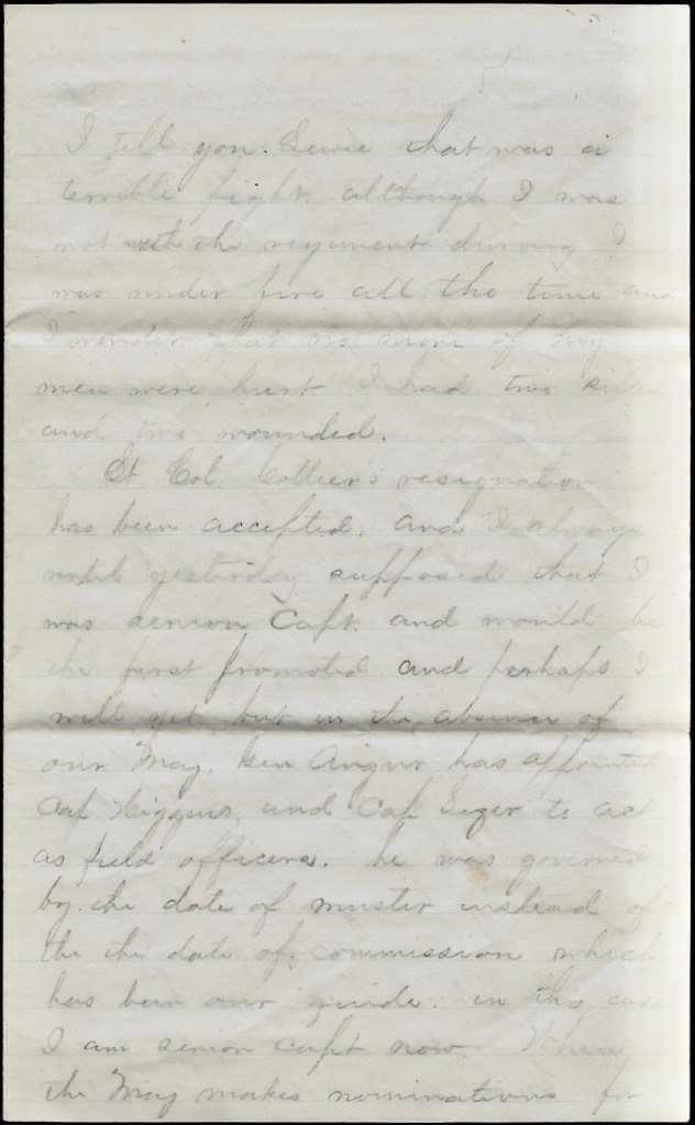 I tell you, Lewie, that was a terrible fight. Although I was not with the regiment during, I was under fire all the time and I wonder that no more of my men were hurt. I had two killed and two wounded. Lt. Col. Collier’s resignation has been accepted and I always until yesterday supposed that I was senior Captain and would be the first promoted and perhaps I will yet. But in the absence of our Major, General Augur has appointed Capt. Higgins and Capt. Sizer to act as field officers. He was governed by the date of commission which has been our guide in this case. I am senior Captain now. When the Major makes nominations for promotions, we will know where we stand and not till then. It is pretty hard to be jumped but if is is so decided, I will try and take it patiently and do my duty as I always have tried to do.