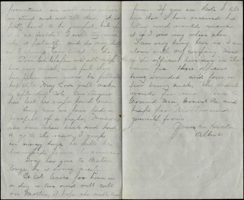 Every time we have had a prospect of a fight, [Lt. John B.] Mason has been taken sick and had to go to the rear. I guess ere many days, he will be dismissed from the service. Gray has gone to Baton Rouge. He is doing nicely. Lt. Col. [Collier] leaves for home in a day or two and will call on Mother. I hope she will see him.